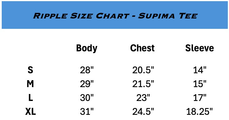 The Ripple Tee is made from 100% American grown Supima® cotton, an ultra soft, long lasting fiber that makes up less than 1% of the world’s cotton. Every shirt is embroidered and tagged in Charleston, SC, and finished with a signature patch made from recycled surf wetsuits. A quiet tribute to second life and coastal roots.